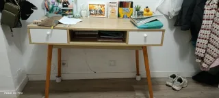 Precioso escritorio de madera en color beige. Está en muy buen estado y es ideal para cualquier estancia. - Un cajón para guardar útiles de escritorio. - Superficie amplia para estudiar o dibujar. - Diseño elegante y funcional.