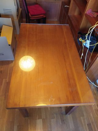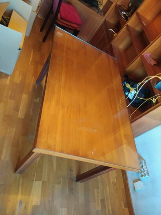 Mesa de estudio con un diseño clásico y elegante. - Acabado en madera de alta calidad. - Amplia superficie de trabajo. - Patas robustas para mayor estabilidad. - Cristal de superficie protector. Viene con un annexo lateral. Tiene marcas no visibless de algunos tornillos, pero es robusta i està perfecta.