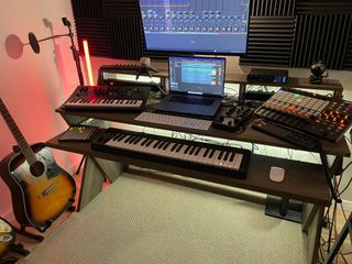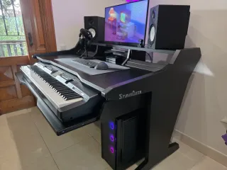 Vendo mesa de estudio StudioDesk Harmony All Black, ideal para producción musical o mezcla en home studio. Construcción robusta con tablero laminado de 25 mm y patas de MDF de 38 mm con acabado satinado. Ofrece 4 U de espacio rack 19", bandeja extraíble para teclado de hasta 88 teclas, estante superior regulable para monitores, gran superficie de trabajo y bandeja de gestión de cables. Sus dimensiones son 1672×996×1024 mm. Con sus 87 kg de estructura maciza, es una mesa extremadamente estable, perfecta para soportar monitores, interfaz audio, controladora y equipo de rack. Solo mesa, sin equipo. Mesa en estado impecable