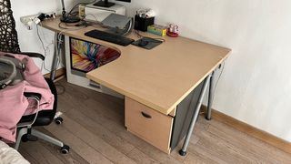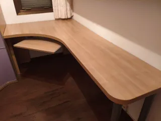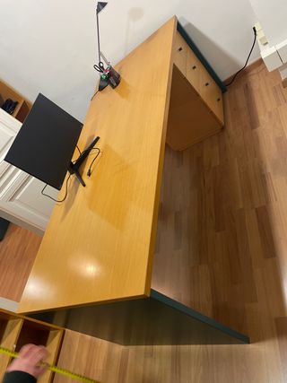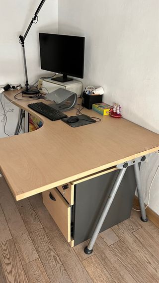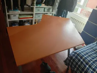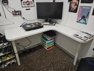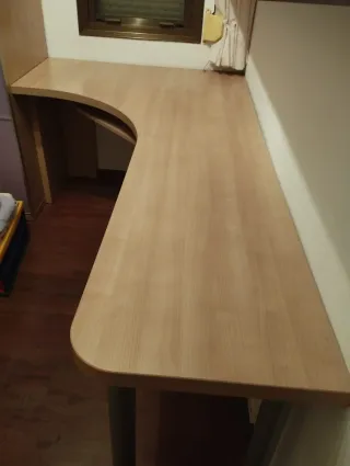 Escritorio amplio en forma de L, ideal para oficina en casa, estudio o setup de ordenador. Muy estable y con gran superficie útil, perfecto para trabajar cómodo. 📐 Medidas: Lado largo: 2,10 m Lado corto: 1,18 m Grosor del tablero: 4 cm Anchura parte corta: 50,5 cm Anchura parte larga: 58 cm aprox. Zona de la esquina: casi 100 cm de ancho ✔ Diseño ergonómico ✔ Color madera clara, fácil de combinar ✔ Soporte extraible para ratón, teclado, etc. ✔ En muy buen estado ⚠️ Importante: Para desmontar y recoger en mi domicilio. 💬 Precio ajustado para retirada rápida. Se puede negociar.