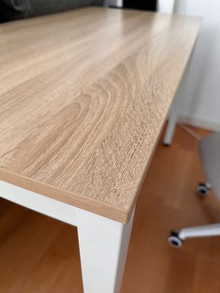 Mesa versátil, ideal para comedor o zona de estudio. Sus patas son regulables para adaptarse a diferentes alturas. - Tablero de madera con acabado natural. - Patas metálicas blancas.