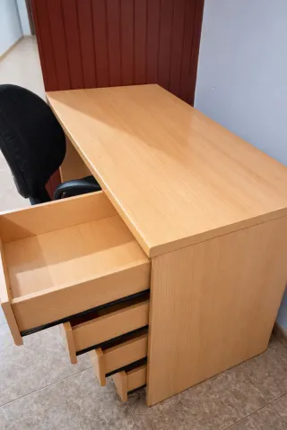 Vendo escritorio de oficina en buen estado, ideal para estudio, teletrabajo o habitación juvenil. 📏 Medidas: - Largo: 120 cm - Fondo: 50 cm 🗄️ 4 cajones amplios, perfectos para guardar documentos y material de oficina 🪵 Color madera clara, fácil de combinar 🧼 Superficie amplia y cómoda para ordenador, pantalla y accesorios Estructura sólida y estable Tiene signos normales de uso, pero está funcional y bien conservado. 📍 Recogida en mano 💬 Cualquier duda, escríbeme sin compromiso. *NO Incluye la silla. -