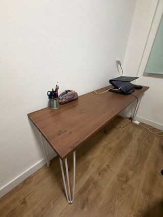Mesa de estudio o trabajo con un diseño moderno y funcional. - Patas de metal resistentes. - Tablero de madera en tono oscuro. Tiene un toque que con masilla de madera se puede solucionar(adjunto foto)
