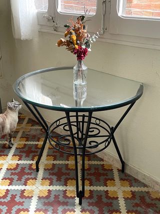Vendo mesa de cristal elegante , ideal para salón, estudio o despacho. Estructura sólida y estable, con cristal templado grueso y resistente. Diseño moderno que combina fácilmente con cualquier estilo de decoración - Patas metálicas negras. - cristal templado 1cm. a recoger en zona Fabra i puig Sant Andrau.
