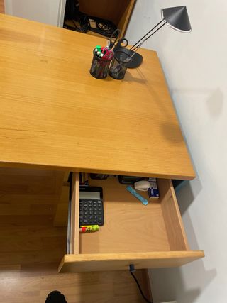 Escritorio de madera con unas medidas de 90 cm de largo, 50 cm de ancho y 75 cm de alto. - 6 meses de uso, en perfecto estado - Diseño moderno y funcional. - Superficie amplia para trabajar o estudiar. - Ideal habitaciones pequeña - No envío
