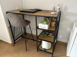 Vendo mesa de escritorio con un diseño moderno y funcional. Ideal para tu espacio de trabajo o estudio. Cubierta de madera clara y estructura metálica negra. Precio en Amazon 57,90 - Tablero de madera con acabado natural. - Estructura metálica. - Medidas: 50 x 100 x 75,5 cm