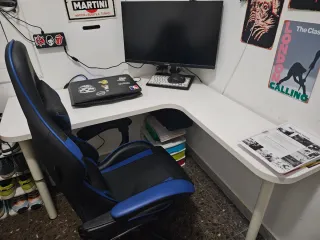 Escritorio moderno, ideal para gaming o estudio. Cuenta con un estante superior y un estante pequeño inferior lateral para mayor organización. - Incorpora 2 soportes para bebidas. Se ha usado unos pocos meses, esta prácticamente nuevo. Se vende con la lamparita de pie que se ve en las fotografías(opcional) +30€