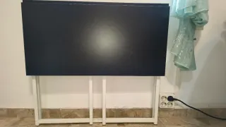 Mesa auxiliar con tablero de aglomerado plegable de color negro y patas de metal blancas. Medidas: 74 cm alto, 80 cm de ancho, 46 cm fondo y 6,5 cuando está plegada. Es muy fácil de plegar y desplegar, no pesa nada y cabe en cualquier parte. Muy fácil de trasladar de una parte de la casa a otra. Muy útil para teletrabajar, estudiar o lo que sea y ponerla en la parte de la casa que mejor nos venga cada momento. El tablero está perfe. Las patas han perdido algo de color en los bordes del uso.