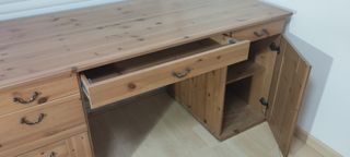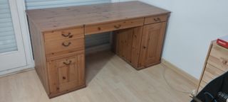 Escritorio de madera con un diseño clásico y funcional. Ideal para cualquier espacio de trabajo o estudio. - Amplia superficie. - Cajones y compartimentos de almacenamiento. - Acabado natural de la madera.