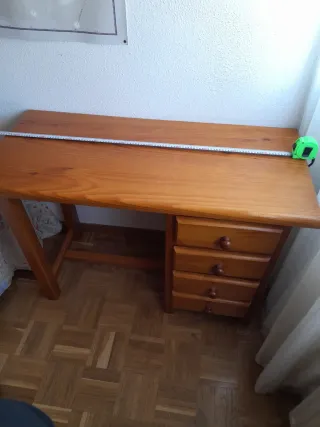 Escritorio de madera de pino macizo, ideal para estudio o trabajo. Cuenta con cuatro cajones para almacenamiento. Largo1.10 ancho 49 cm alto 77 cm tiene algún arañazo - Fabricado en pino macizo. - cuatro cajones con tiradores redondos. - Diseño clásico y funcional.