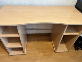 Elegante escritorio con un diseño curvo y moderno, ideal para tu espacio de trabajo o estudio. Su forma orgánica añade un toque distintivo. - Superficie amplia y fluida. - Compartimentos de almacenamiento integrados. - Acabado en tono madera natural/cerezo. Falta listón de cantear en filos q se aprecian en foto q se incluye también para pegarlo y dejarlo como nuevo. Recoger en Pozuelo de Alarcón
