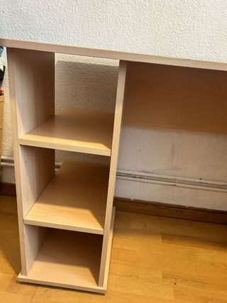 Mesa de estudio con un diseño moderno y funcional, perfecta para cualquier espacio. - Acabado en madera clara. - Amplia superficie de trabajo. - Compartimentos de almacenamiento integrados.