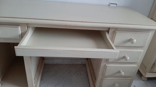 Escritorio de madera buena (de nogal o pino) en color crudo con remates envejecidos. Tiene una bandeja extraíble, 5 cajones y un compartimento hueco bastante grande. Esta parte es la que está algo más rozada, y la parte central de la mesa en sus bordes, pero poco porque siempre ha estado protegida por un cristal (el cristal no se incluye). Es perfecto para que tu hijo estudie con amplitud.