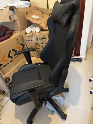 Silla de gaming ergonómica en color negro. Diseñada para largas sesiones de juego o trabajo. - Respaldo alto con soporte lumbar. - Reposacabezas ajustable. - Brazos acolchados. - Base giratoria con ruedas.