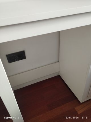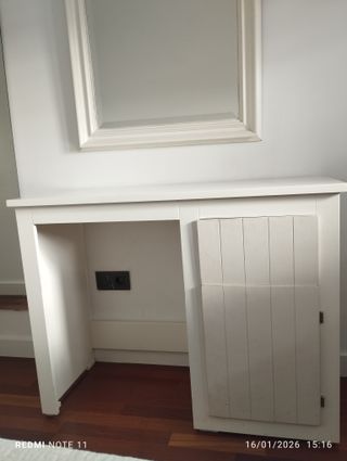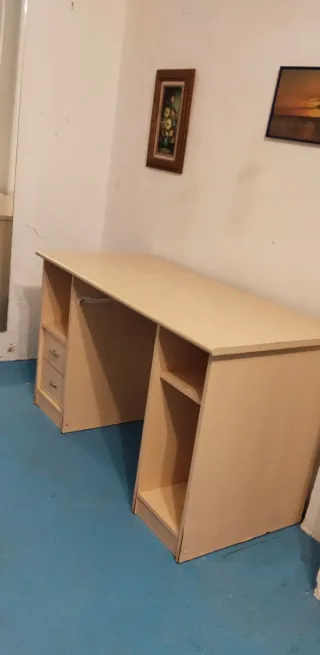 Mesa de estudio , con balda extraible, Con un cajón y un compartimento vertical dividido en dos .De color beis y el frontal del cajón en tono gris azulado . Medidas, = 1 metro de largo ,82 cm de alto y 43 cm de fondo. La balda extraible mide 52 cm de largo. El cajón mide 40 cm de largo por 30 cm de fondo. Y el compartimento doble es de 25 cm y 18 cm respectivamente. La mesa es nueva, perfecta para estudio , y por sus medidas es ideal para dormitorios ,no grandes o medianos .mesa con mucha capacidad. La tengo en el morche (málaga) .único precio,un chollo