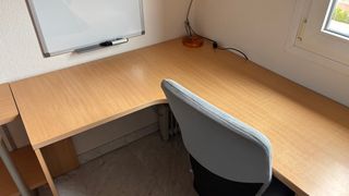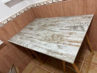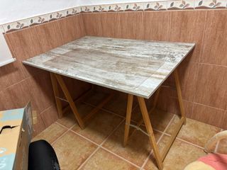 Combinación de mesa de escritorio con patas de madera y superficie de madera. - El grueso del tablero es de 2 cm. - Patas de madera maciza. - Encimera de madera en blanco Tiene uso y se ve en las marcas de la mesa que aparecen en las fotos, pero esta en muy buen estado no tiene un defecto grande ni esta roto por ningún lado, solo marcas de uso. Muy cómodo para estudio y muy espacioso a la hora de trabajar sobre el. El mueble que es de pata es muy espacioso y le cabe mucho almacenaje.