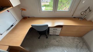 Mesa de estudio juvenil con espacio de almacenamiento y estantería. - Diseño moderno y funcional. - Acabado en madera clara. - Estructura robusta. Las medidas del escritorio y el arcón van en una de las fotos. Se puede cortar y adaptarlo a la medida de la habitación. La medida de las baldas de la estantería es de 136,5 x 32 cm regulables en altura que es de 236 cm. Con fijación en pared.Se vende todo el conjunto.