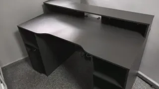 Mesa de escritorio o de estudio. La tabla tiene algunas marcas de uso y dos de las cuatro patas tienen la regulación original floja , de manera que con bridas metálicas se regula. Trae además un colgador para un ordenador de sobremesa. La mesa tiene su uso, pero por el precio que está tiene mucha vida por delante. La altura es regulable con las patas , de forma que se puede usar desde una altura de 60 aproximadamente hasta 90 o 1 metro