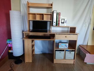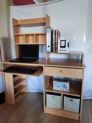 Escritorio de madera en buen estado. Ideal para estudio. MEDIDAS EN LA ÚLTIMA FOTO. - Perfecto para organizar tu espacio de trabajo. Varios huecos disponibles. - Diseño elegante y funcional. - Incluye un estante superior para la pantalla. - Lateral para torre PC. - Balda extraible para el teclado.