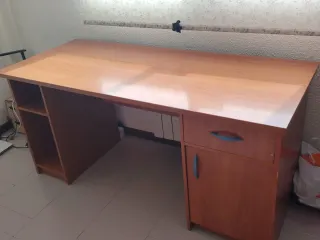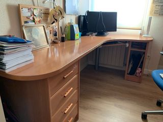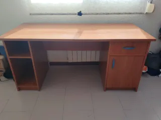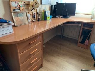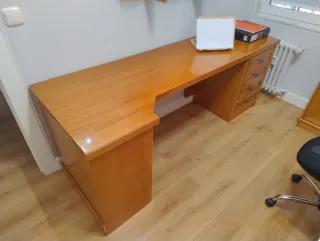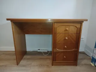 Mesa de trabajo de madera de cerezo. La vendemos por falta de uso. Tiene alguna marca de uso (adjunto fotografías de todo). Tiene hueco para CPU y para la impresora con bandejas móviles (adjunto fotografía) para mejor acceso. Tiene un cajón de 48,5cm de ancho x 52cm de largo y otro de 46 cm de ancho x 52 de largo. El hueco en el que nosotros tenemos la CPU mide 48,5 x 23cm (alto x ancho). Y el hueco en el que tenemos la impresora mide 25 x 46cm (alto x ancho). La mesa cuenta con un hueco en la parte posterior-superior para el paso de cables de pantalla teclado etc..