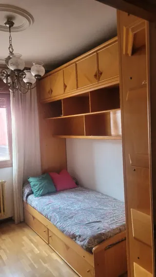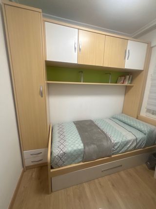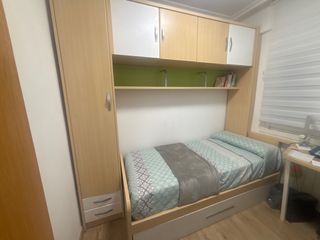 Se vende dormitorio completo. - Cama individual con cabecero de madera. - Cama nido con colchón bajo la cama principal. - Mesita de noche de madera. - Cómoda de madera con dos puertas y estante interior. -Dos estanterías a juego . -Posibilidad de mesa de estudio a juego de 2,05*0,55 con 4 cajones (100€)