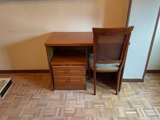 Escritorio de madera con cajonera y silla a juego con respaldo de rejilla. Ideal para dormitorio, estudio o decoración vintage. Muebles sólidos y funcionales. Se venden juntos. Recogida en domicilio.