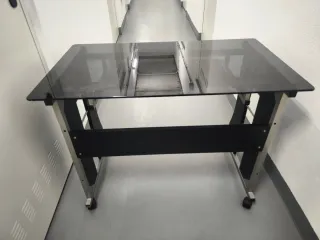 Mesa de estudio con superficie de cristal negro y estructura metálica. - Diseño moderno y elegante. - Patas con ruedas para fácil movilidad y bloqueo. - Bandeja inferior adicional.