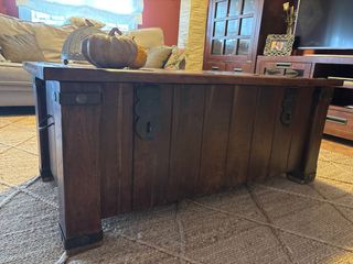 Mesa de centro con un diseño rústico y robusto, perfecta para dar un toque especial a tu salón. - Estructura principal de madera. - Detalles y herrajes de metal. - Acabado en tono marrón oscuro.