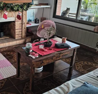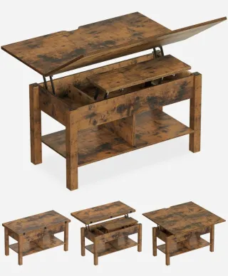 Mesa de centro versátil con diseño moderno. - Tapa elevable para mayor comodidad. - Estructura robusta de madera y metal. - Acabado rústico en tonos marrones y multicolor. Las imágenes son de referencia (Amazon). Incluyo la mejor foto real que dispongo en la que se puede apreciar su dimensión y color. *Se vende por reciente mudanza y reducción de espacio, no por defecto. El artículo no está en uso actualmente y se encuentra en un trastero correctamente almacenado, limpio y protegido. *El artículo ha tenido poco uso durante apenas unos meses (6 aprox.) *Entrega en mano en la entrada principal del trastero para mayor seguridad.