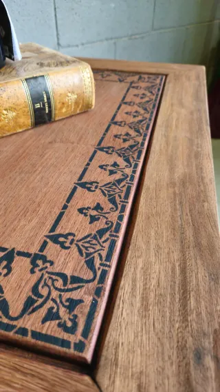 Mesa redonda con un diseño rústico y un detalle central que simula un sol. - Tablero de madera con incrustaciones. - Diseño floral en el centro.