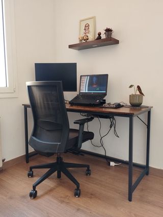 Escritorio en forma de L con un diseño moderno y funcional. - Estructura robusta de metal. - Superficie de madera con acabado rústico. - Estante inferior para almacenamiento adicional. -Ladron con interruptor incorporado -Leds rgb -Lado corto 78cm, lado largo 108cm Solo recogida en mano en zona example
