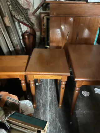 Conjunto de tres mesas auxiliares de madera maciza de roble. Son perfectas para añadir un toque rústico a cualquier espacio. - Fabricadas en roble macizo. - Diseño clásico con patas torneadas. - Se venden las tres juntas. -de la prestigiosa marca Danves