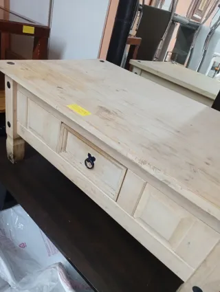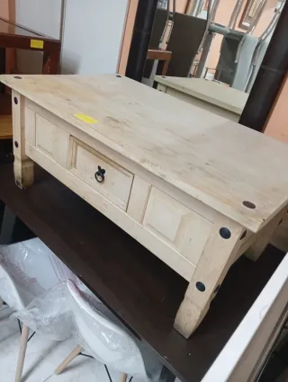 Mesa de centro con un diseño rústico y elegante. - Acabado en madera clara. - Cajón frontal con tirador. - Patas robustas con detalles metálicos. Contacto: Llamar tel o contactar WhatsApp : 645 362 526