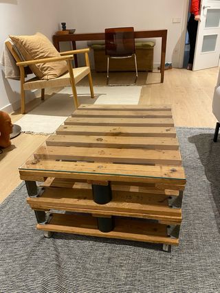 Mesa de centro con un diseño industrial y rústico, fabricada a mano con palets de madera. Cuenta con ruedas para facilitar su movilidad. - Tablero superior de cristal. - Estructura de madera robusta. 60x 80 - Ruedas para desplazamiento.