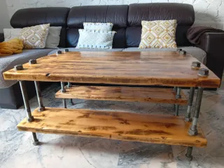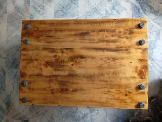 Mesa rústica con un diseño industrial, de madera maciza de pino. Medidas 99x69x48cm aproximadamente. Se puede desmontar para facilitar el transporte - Tablero de madera con vetas marcadas. - Estructura y remaches metálicos. - Combinación de colores marrón y plateado.