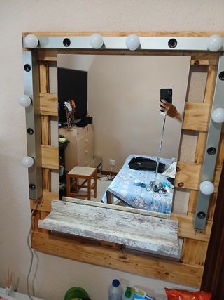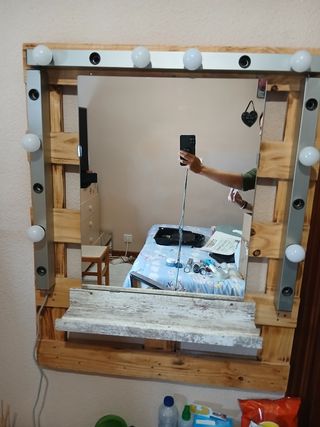 Tocador con un diseño rústico y moderno, perfecto para cualquier espacio. - Marco de madera con acabado natural. - Detalles metálicos plateados. - Espejo central. - Luces integradas alrededor del espejo. Muy buena iluminación. Me tengo que deshacer de él por cambios de habitación pero realmente me súper encanta