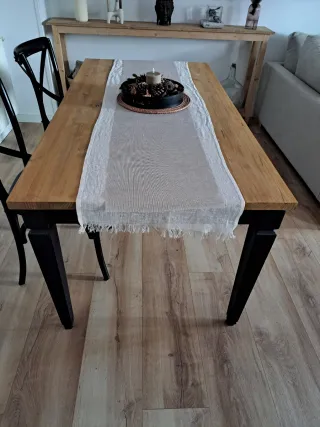 Mesa de comedor con un diseño rústico y elegante. Su superficie de madera aporta calidez a cualquier espacio. - Patas de color negro. - Acabado en madera natural.