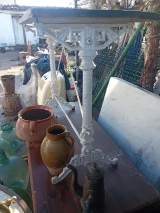 Mesa antigua con base de hierro forjado y tablero de madera. - Base de hierro pintada en blanco con detalles ornamentales. - Tablero de madera con acabado rústico. - Ideal para decoración vintage o exterior.