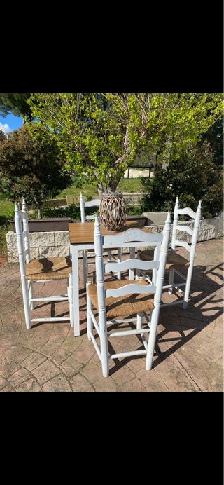 Conjunto de mesa y cuatro sillas con un diseño rústico y encantador, perfecto para exteriores. - Estructura de madera pintada en blanco. - Asientos de ratán. - Mesa con sobre de madera.