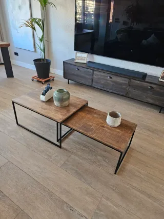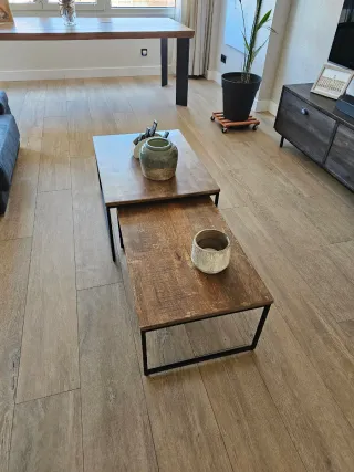 Conjunto de dos mesas auxiliares con un diseño moderno. - Tableros de madera con acabado rústico. - Patas de hierro negro. Se venden por cambio de decoración. Medidas 80x60x40 (largo, ancho y alto) la grande y 80x50x35 la pequeña. Pueden combinar se varias formas tal y como se ve en las fotos. Recogida en zona de la Piovera / Campo de las naciones.