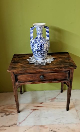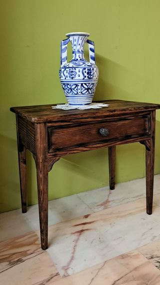 Mesa auxiliar de madera muy antigua con un práctico cajón, con tirador metálico labrado. La mesa presenta bonitas betas y manchas propias de su antigüedad y uso, haciendo de ella una pieza muy bella y única. Ideal para ambientes rústicos o decoraciones donde se precise una pieza con presencia y funcionalidad. - Diseño rústico y elegante. - Tirador decorativo en el cajón. - Patas de madera con detalles tallados.