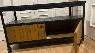 Mesa de TV de la maison du monde con un diseño industrial y moderno, perfecta para complementar tu salón. - Estructura robusta de metal. - Tableros de madera con acabado rústico. - Ruedas para facilitar su movilidad.