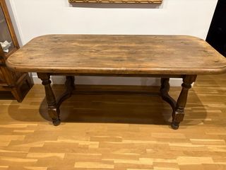 Mesa de comedor finales del siglo XIX / principios del siglo XX, realizada en madera maciza, proveniente de herencia familiar. Ccon tablero de gran tamaño y estructura robusta. Patas torneadas, travesaños inferiores y pie central macizo, que le aportan gran estabilidad y presencia. Se vende junto con sillas de misma epoca . El tablero presenta pátina original y señales normales de uso acordes a su antigüedad. Es una mesa ideal tanto para uso diario como para proyectos de restauración o decoración clásica/rústica. Se vende junto con 6 sillas de madera maciza y misma epoca. Se recoge en zamora en sábados. Medidas aproximadas