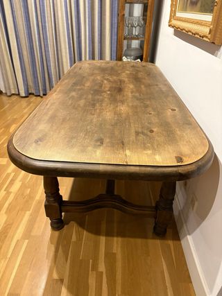 Mesa de comedor de estilo rústico, ideal para reuniones familiares o cenas con amigos. Su diseño aporta calidez a cualquier espacio. - Forma ovalada. - Patas torneadas. - Acabado en madera natural. Tiene bastante uso pero se puede lijar ya que es de madera maciza.