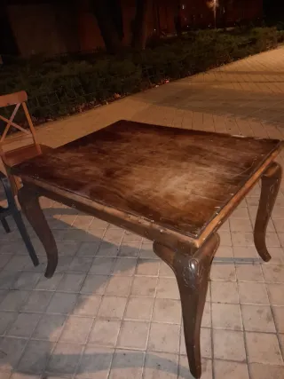Elegante mesa de madera con un diseño clásico y patas curvas. - Tablero cuadrado. - Patas talladas con detalle. - Acabado envejecido. MEDIDAS: largo 1'5 ancho 87 alto 77