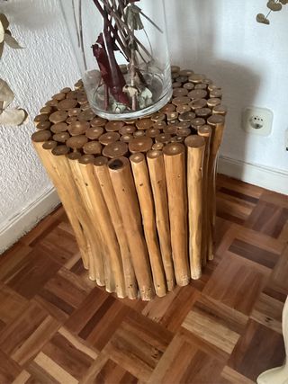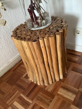Original mesa auxiliar con un diseño único que combina la calidez de la madera con un toque moderno. - Base de troncos de madera. - Superficie superior de cristal.