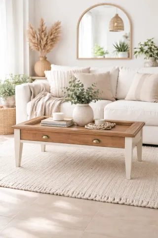 Mesa de centro con un acabado decapado que le da un toque rústico y elegante. - Diseño con un cajón central. - Patas curvas con estilo. - Acabado en tonos beige y marrón.