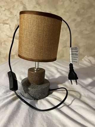 Lámpara de mesa con un diseño rústico y materiales naturales. - Base de piedra y madera. - Pantalla de tela tipo yute. - Interruptor en el cable.poco uso esta casi nuevo negociable