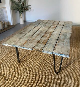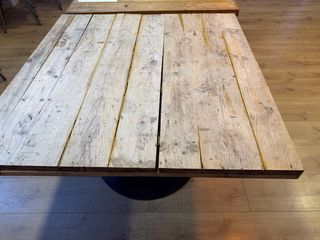 Mesa de comedor o terraza con un diseño rústico y un acabado desgastado que le da un carácter único. - Medidas: 2.30 metros de largo por 0.91 metros de ancho. - Materiales: Madera