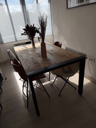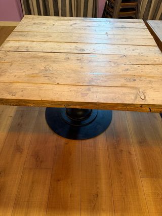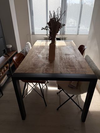 Mesa de comedor o auxiliar con un diseño rústico y robusto. Su superficie de madera aporta calidez y carácter a cualquier espacio. - Tablero de madera con acabado natural. - Base central de metal negro.